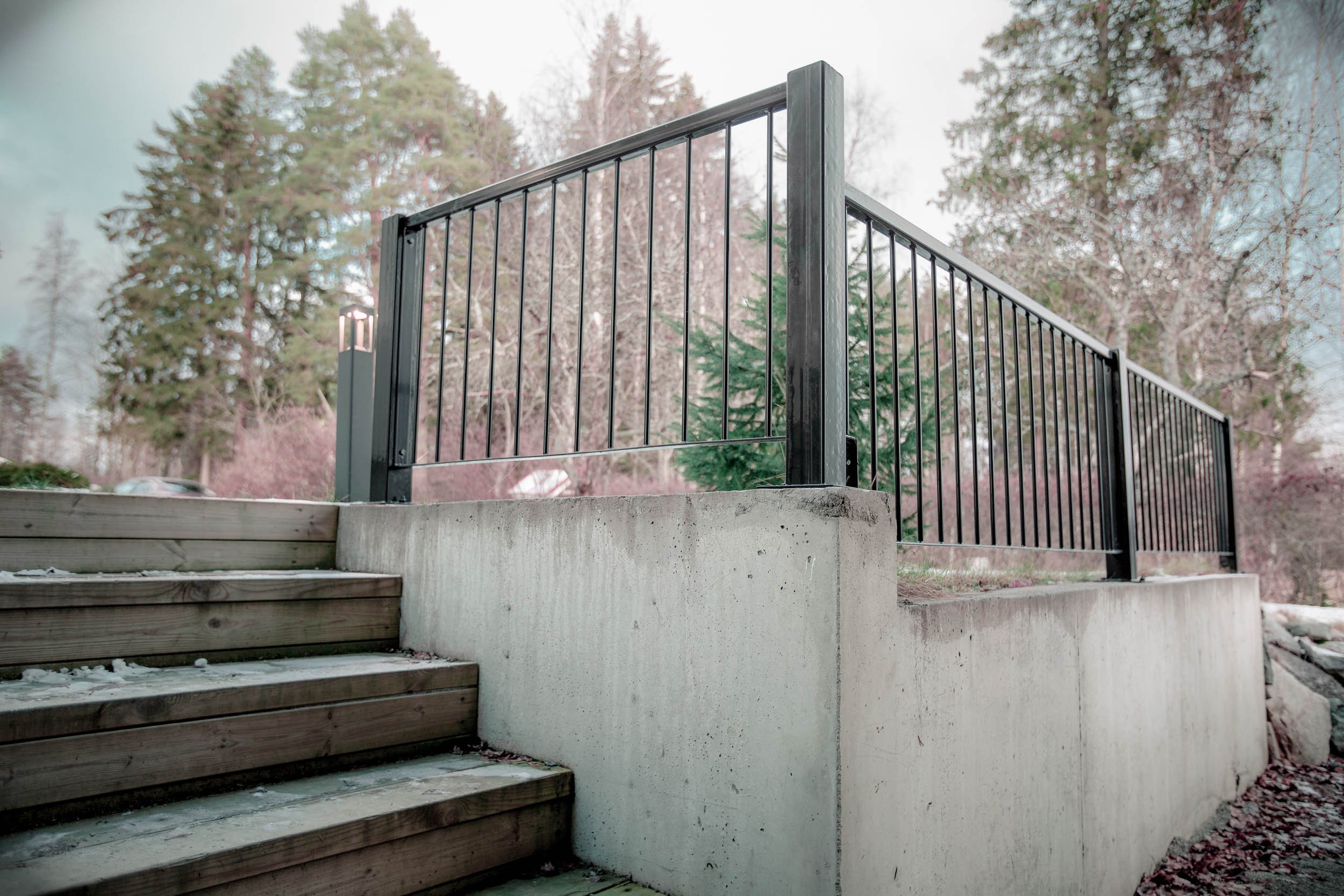 Tässä kohteessa jyrkkään pihaan oli luotu selkeyttä uudella betonimuurilla, johon JKP Division toimitti asiakkaan toiveiden mukaiset teräskaiteet näyttävillä terästolpilla.